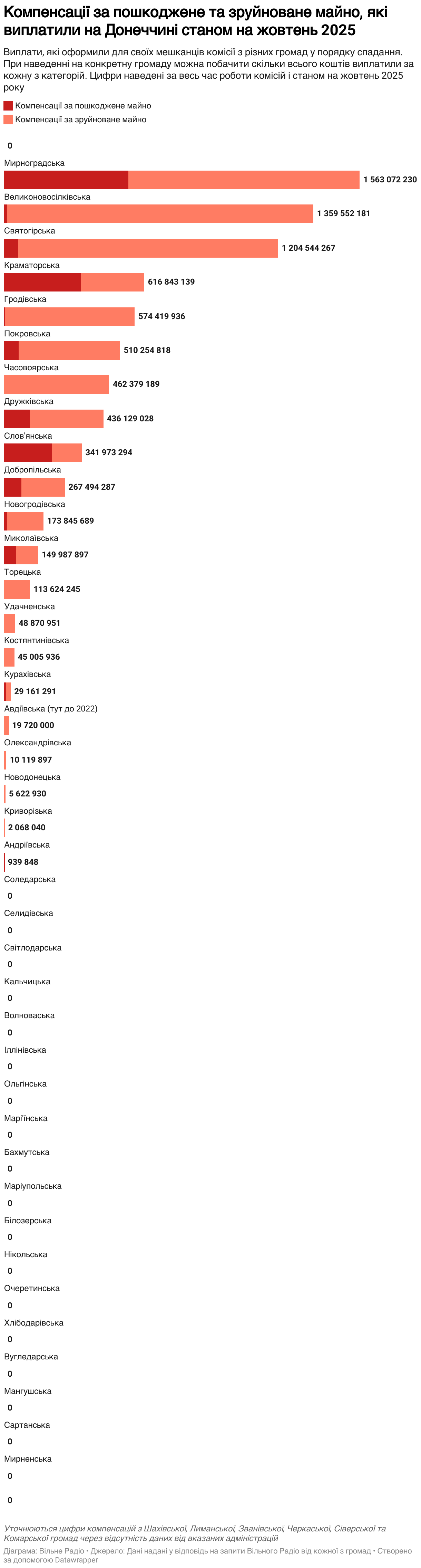 В Мирноградской громаде в текущем году также не зафиксировано выплат за поврежденное жилье. В 2022–2023 годах выплаты за полностью разрушенные объекты в Мирнограде не проводились ввиду отсутствия на тот момент масштабных разрушений. Однако по состоянию на 30 октября 2025 года общая сумма начислений за уничтоженное жилье в этой громаде составила около 1,02 млрд грн.