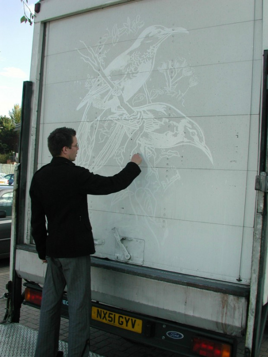 Данное направление уже известно обществу, но по-прежнему вызывает удивление. 52-летний американский график Скотт Уейд стал известным в области потрясающих рисунков на пыльных стеклах автомобилей. Раньше он рисовал пальцем, сейчас использует кисти.