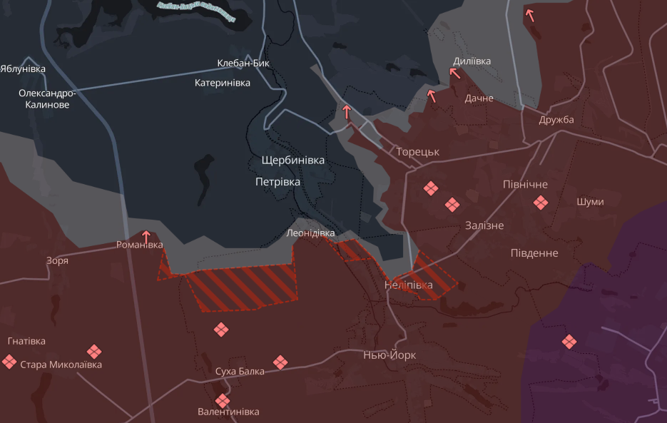 Противник занял новые позиции к югу от Константиновки: возле Нелиповки, Романовки и Леонидовки, а также возле Новоторецкого (в сторону Мирнограда), сообщает DeepState утром 24 июня.