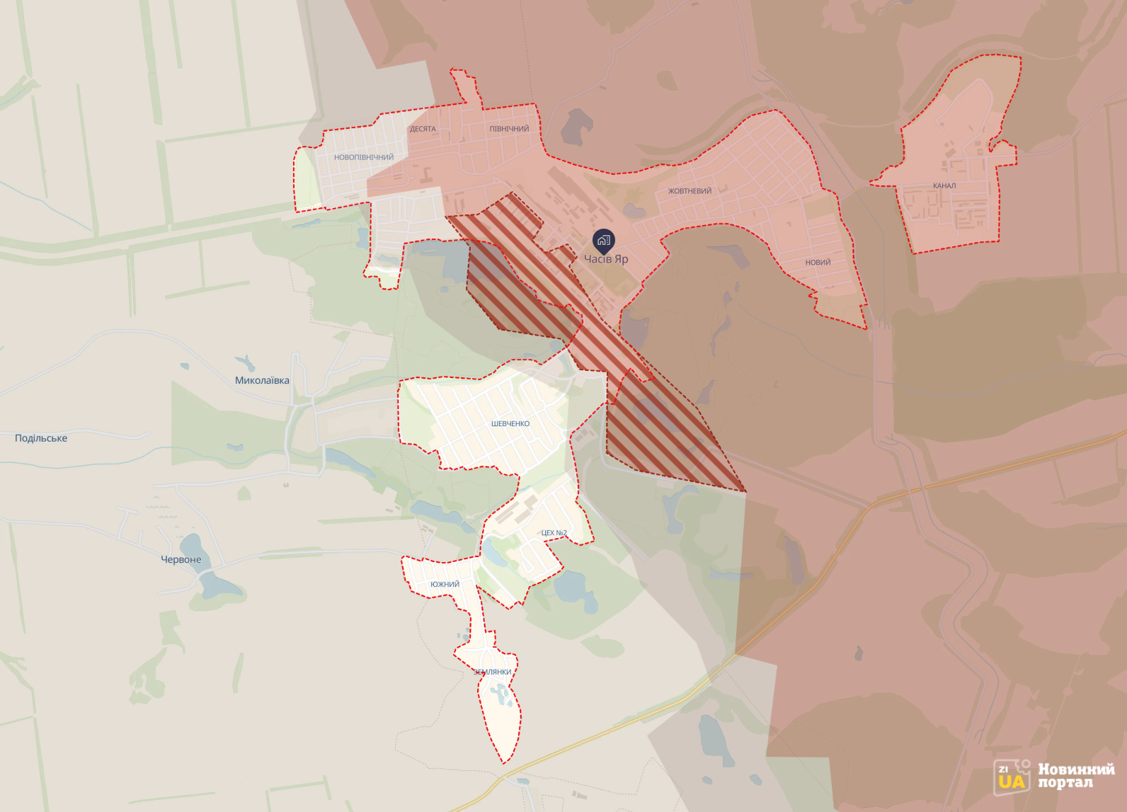 Паблик отмечает продвижение армии РФ в центральной части Часового Яра, однако не подтверждает полный его захват, о котором сообщало вчера минобороны РФ. На карте указан контроль ВСУ южных районов города: Шевченко, Цех №2, Южный и Землянки.
