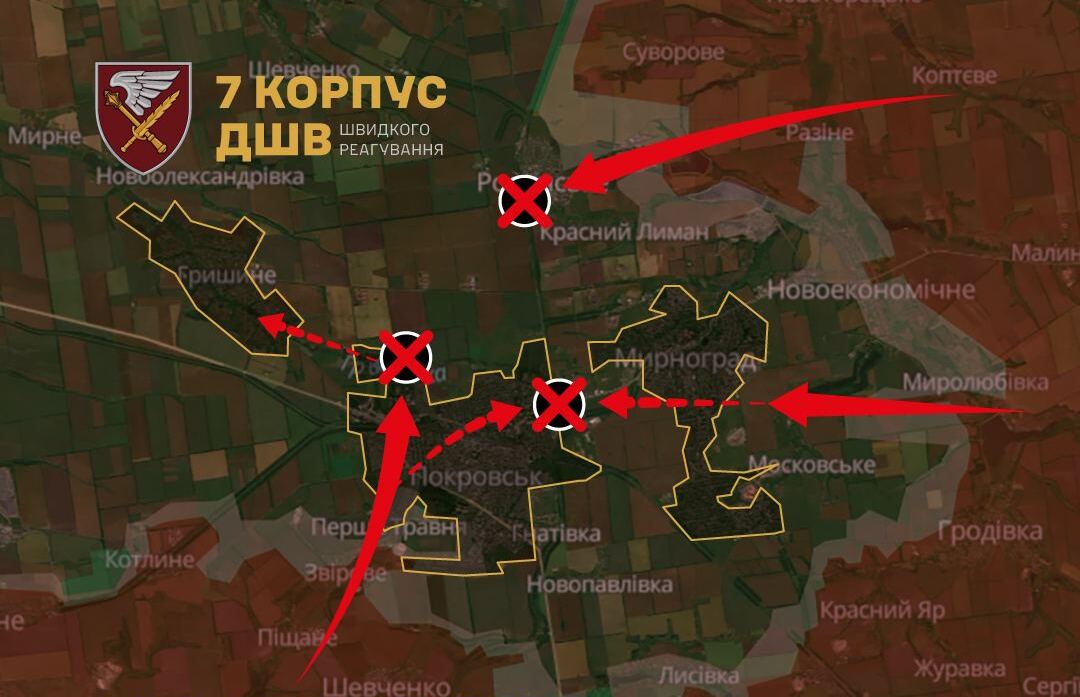 По информации 7 корпуса ДШВ, для оцепления Покровской агломерации армия РФ привлекла около 11 тысяч бойцов. Российские группы, которым удалось инфильтрироваться в городе, преследуют цель продвинуться на северо-запад и север от Покровска.