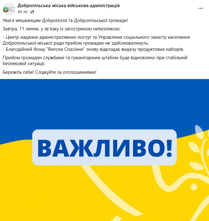 Также в городе приостановили выдачу гуманитарной помощи из-за ухудшения ситуации безопасности, сообщает Добропольская городская военная администрация на странице в соцсетях.