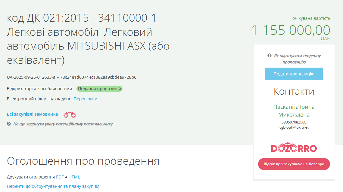 Согласно тендерной документации, на покупку выделят более 1 миллиона гривен. Машина должна быть полноприводной, с вариаторной коробкой передач и бензиновым двигателем объемом не менее 1998 куб. см и мощностью от 150 лошадиных сил.