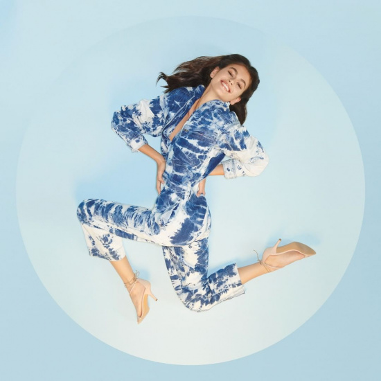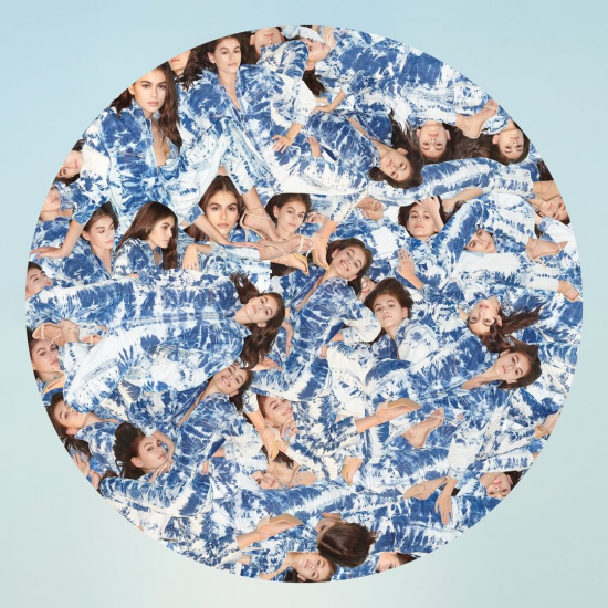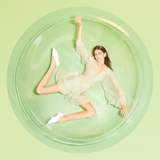 На опубликованных фото Кайя позирует в бело-синем костюме, выполненном из органического коттона. Снимки заключены в круглые рамки, которые являются частью символического посыла новой коллекции.