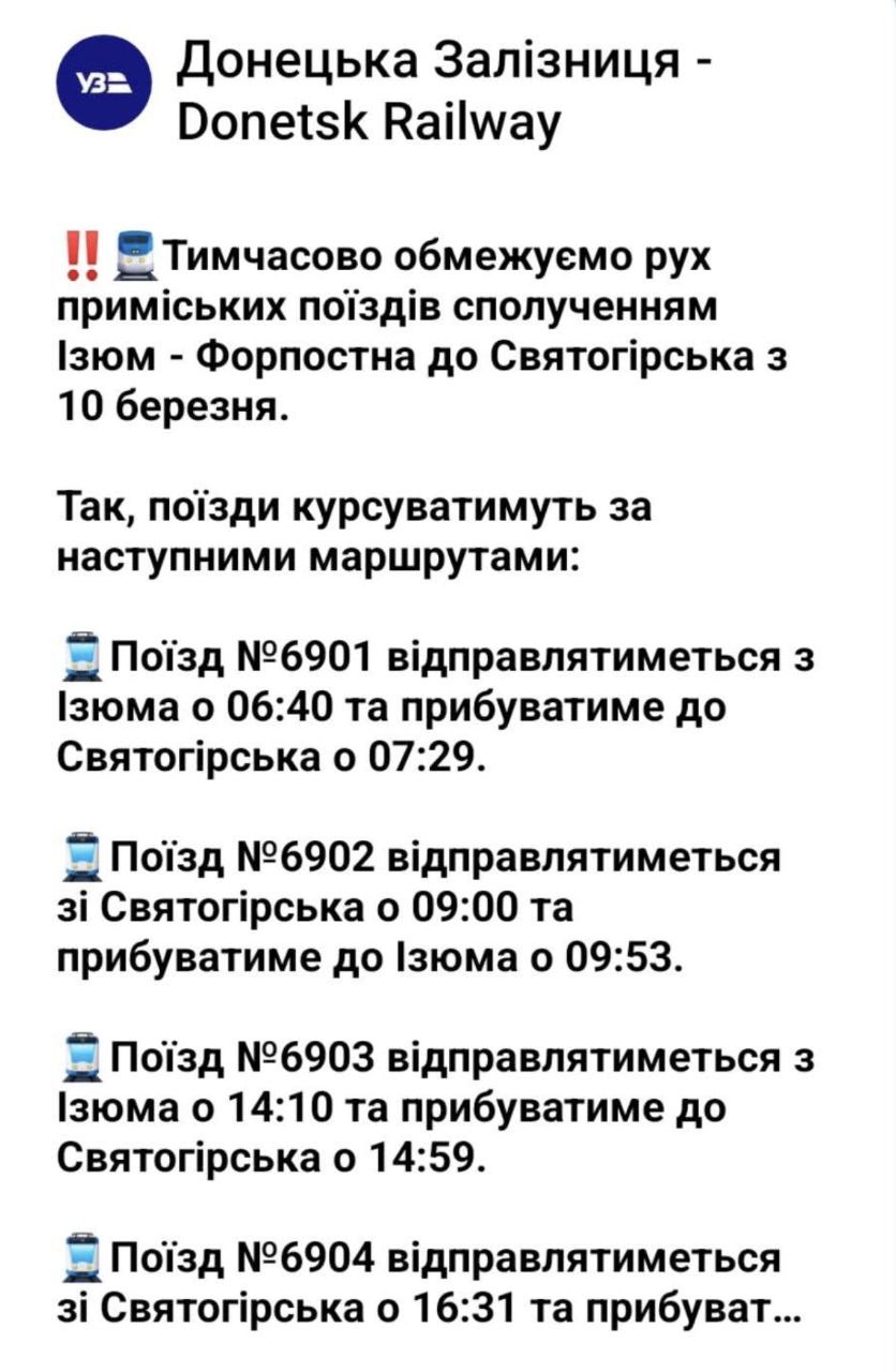 В Донецкой области временные ограничения в движении пригородных поездов с 10 марта.