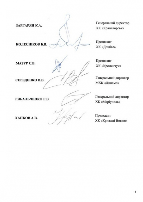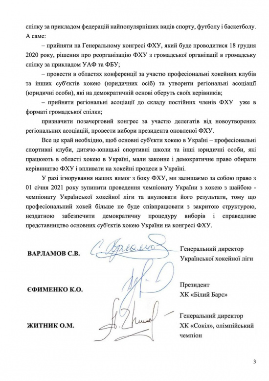 - В случае игнорирования наших требований со стороны ФХУ, мы, нижеподписавшиеся, оставляем за собой право с 01 января 2021 года остановить проведение чемпионата Украины по хоккею с шайбой — чемпионата Украинской хоккейной лиги и аннулировать его результаты, потому что профессиональный хоккей не будет более сотрудничать с закрытой структурой, не способной обеспечить демократическую процедуру выборов и справедливое представительство основных субъектов хоккея Украины в конгрессе ФХУ.