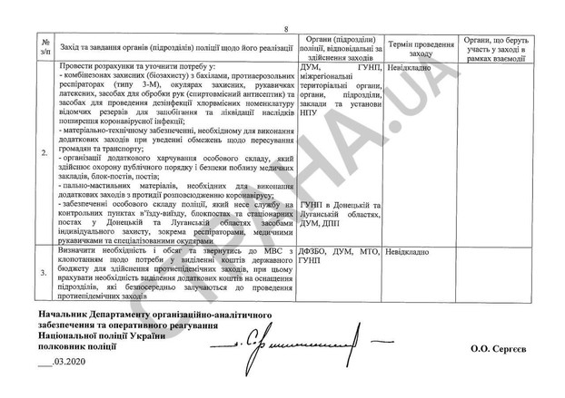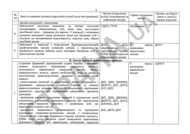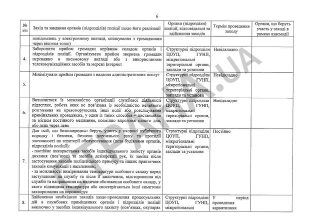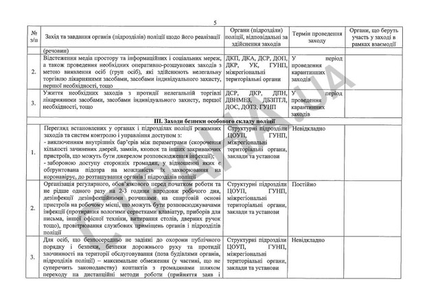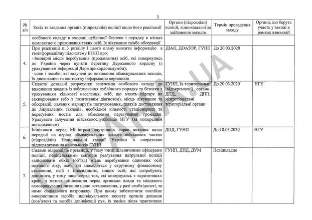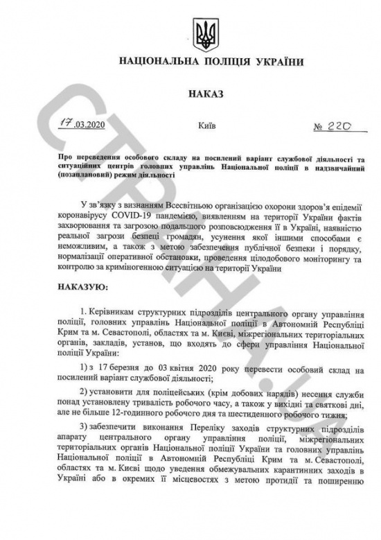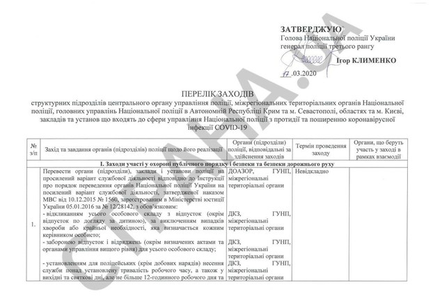 Глава Национальной полиции Украины Игорь Клименко подписал приказ под номером 220 от 17 марта 2020 года о мероприятиях по противодействию коронавирусу. Он регламентирует действия правоохранителей в период карантина, сообщает издание