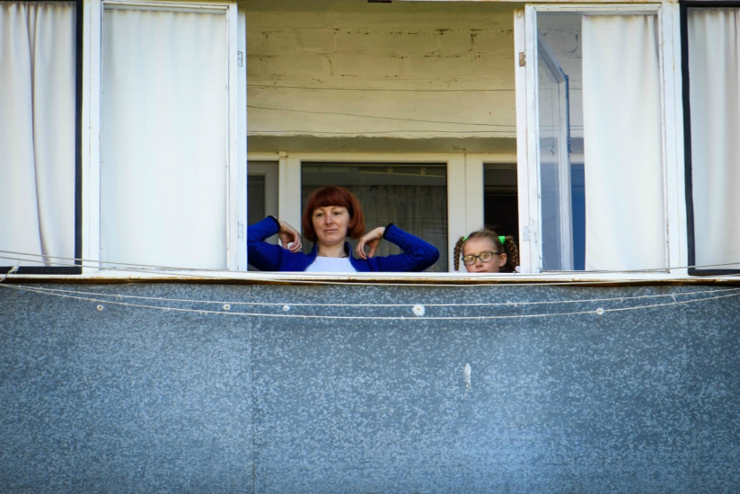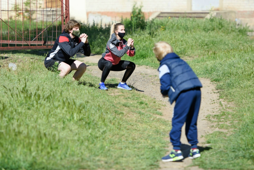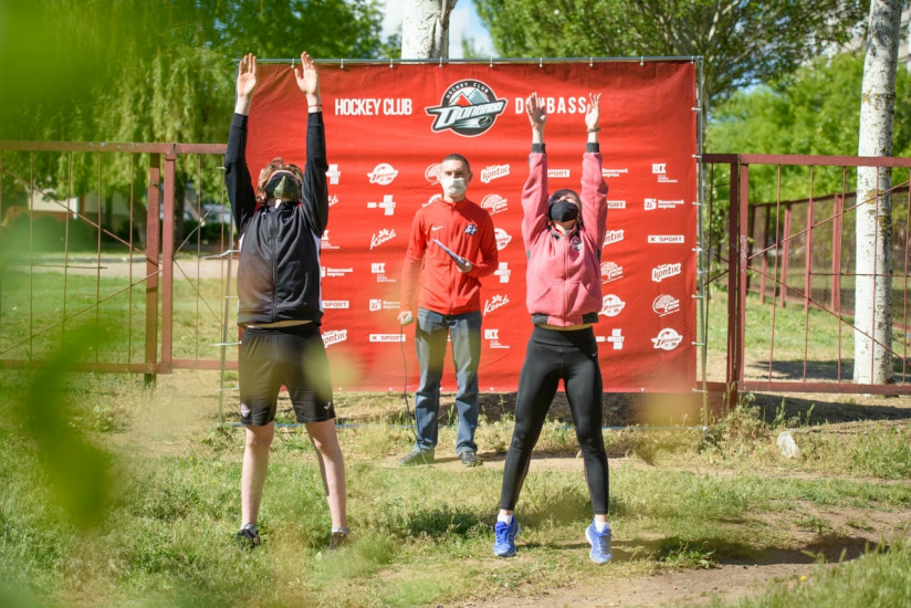 Жители домов по улице Энгельса смогли выйти на свои балконы, а также смогли присоединиться к разминке на спортивной площадке и выполнить комплекс упражнений, который продемонстрировали воспитанница отделения фигурного катания ДЮСШ ХК «Донбасс» Елизавета Велигонова, а также игрок «Донбасса 2004» Никита Сидоренко.
