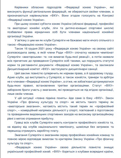 Это заявление полностью противоречит нормам права и здравому смыслу. Ведь выступающие в Суперлиге клубы, а также хоккеисты, тренеры и арбитры не являются членами "Федерации хоккея Украины", а значит, не обязаны соблюдать какие-либо правила, установленные третьими организациями. Устав "ФХУ" запрещает участвовать в соревнованиях, проводимых не под эгидой организации, только своим членам.