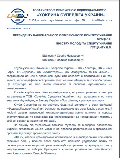 Учитывая это, а также грубое нарушение норм хозяйственного и уголовного права отдельными должностными лицами "Федерации хоккея Украины" и предыдущие противозаконные действия со стороны "ФХУ", в адрес Президента Национального олимпийского комитета Сергея Бубки и Министра молодёжи и спорта Украины Вадима Гутцайта было направлено обращение с просьбой принять меры касательно действий "Федерации хоккея Украины", а также содействовать в проведении реорганизации нынешней "ФХУ" в общественный союз с последующими демократическими выборами на всех уровнях.