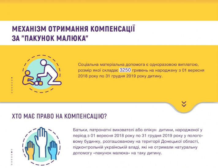 Также стало известно, что сумма компенсации составит 3250 гривен разовой выплаты на каждого ребенка. По данным ОГА, что данная сумма соответствует средней стоимости «пакета малыша» в течение 2018-2019 годов«.