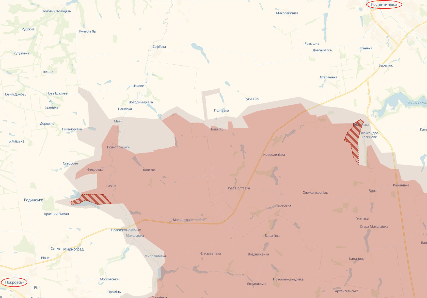 Фиксируется продвижение россиян по обе стороны на выступе между Покровском и Константиновкой: в Яблоновке Ильиновской громады (к югу от Константиновки) и у Разиного Гродовской громады (к северу от Мирнограда).