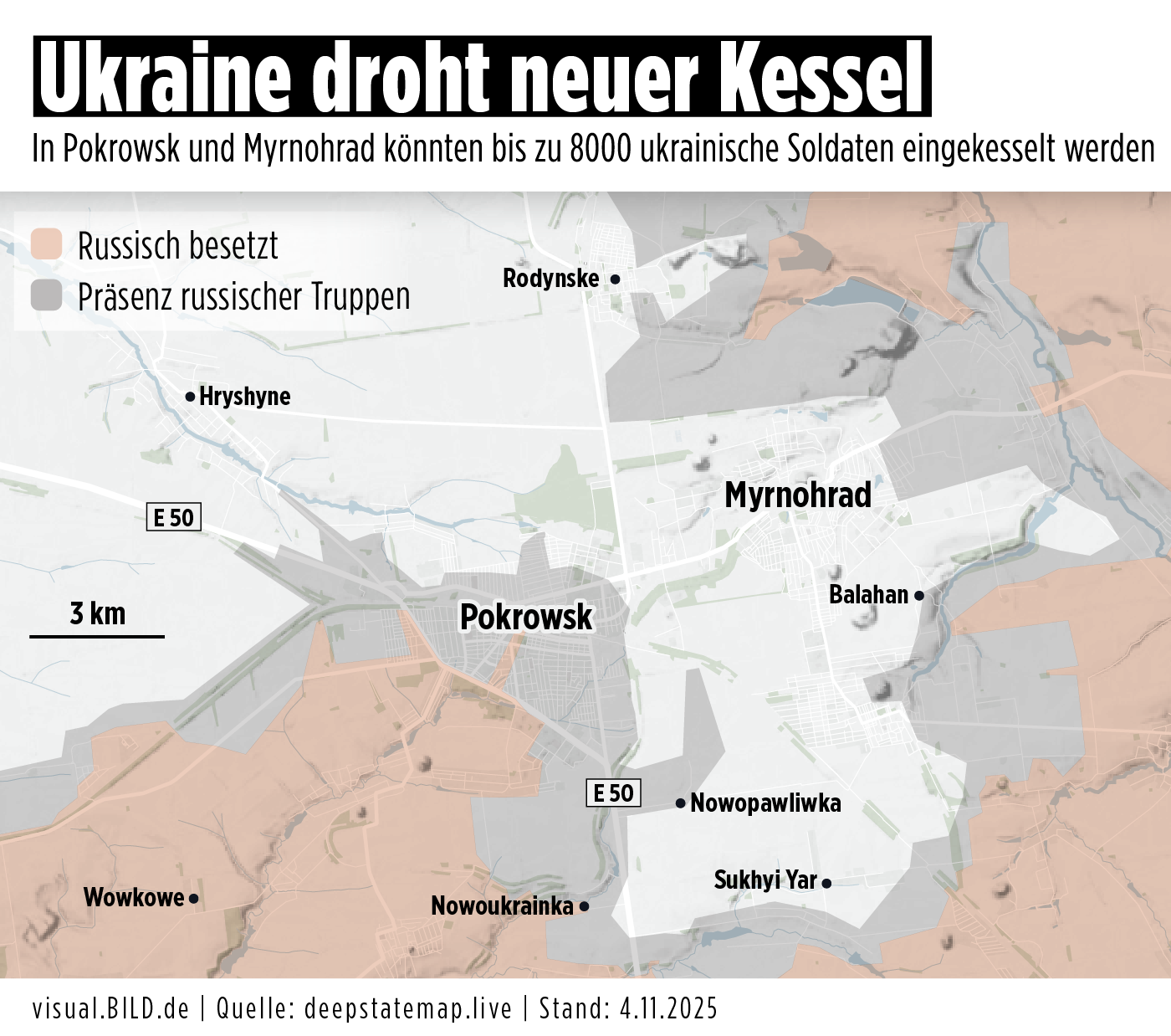 Это подтвердил украинский солдат в Мирнограде, примерно в 7 километрах к востоку от Покровска: «Даже если бы мы получили приказ отступать, мы бы, вероятно, не пережили его. Вероятно, никто из нас не доберётся до Родинского живым. Лучше оставаться на месте и позволить себя освободить или схватить в конце концов».