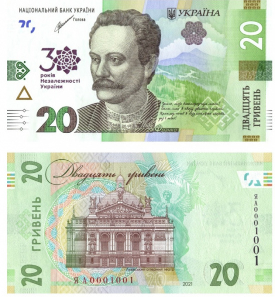 За основу новой банкноты номиналом 20 гривен будет взять образец 2018 года с подписью председателя НБУ Кирилла Шевченко серии ЯА 2021 года выпуска. Размер банкноты – 69 x 130 мм. Основной рисунок лицевой стороны – портрет Ивана Франко, главное изображение обратной стороны – здание Львовского оперного театра.