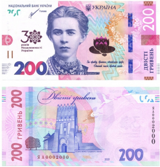 Для банкноты в 200 гривен был взят образец 2019 года с подписью Кирилла Шевченко серии ЯА 2021 года. Размер банкноты – 75 x 148 мм. Основное изображение лицевой стороны – портрет Леси Украинки, главный рисунок обратной стороны – въездная башня Луцкого замка.