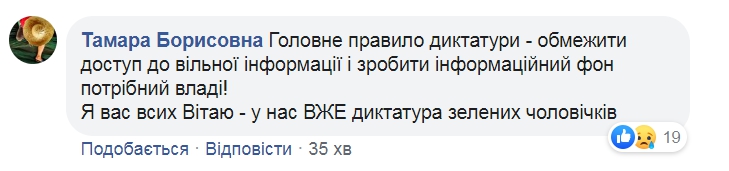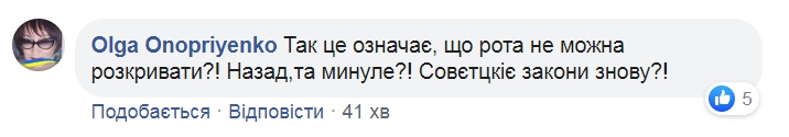 «Такая реакция — это явно колокольчики тоталитаристских замашек. И эти колокольчики звонят все чаще», «Трудно это осознать», «Это треш. Очередные колокольчики тоталитаризма», «Вы так, мальчики, далеко зайдете, пружина же имеет предел сжатия», «Главное правило диктатуры — ограничить доступ к свободной информации и сделать информационный фон, нужный власти! Я вас всех поздравляю — у нас уже диктатура «зеленых человечков», «Так это означает, что рта нельзя раскрывать?! Назад в прошлое?! Советские законы снова?!» — негодуют украинцы.