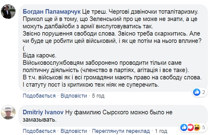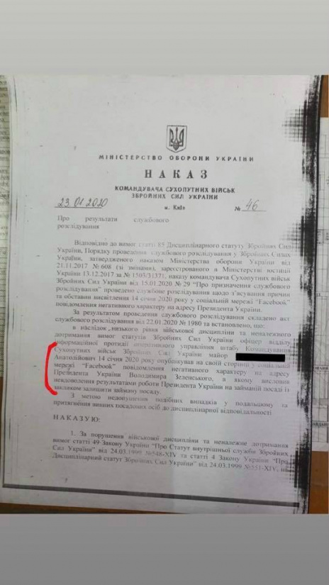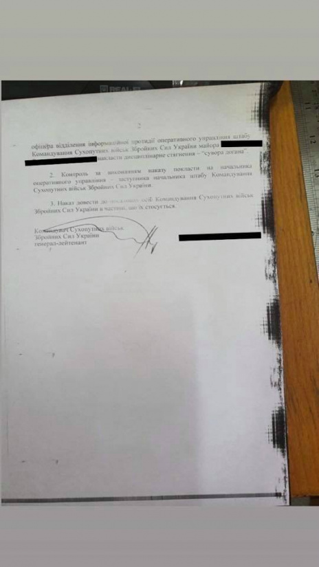 «За нарушение военной дисциплины и ненадлежащее соблюдение требований статьи 49 Закона Украины «Об Уставе внутренней службы ВСУ» и статьи 4 Закона Украины «О Дисциплинарном уставе ВСУ», на офицера отделения информационного противодействия оперативного управления штаба Командования Сухопутных войск ВСУ майора... наложить дисциплинарное взыскание — строгий выговор», — сказано в приказе командующего Сухопутными войсками ВСУ.
