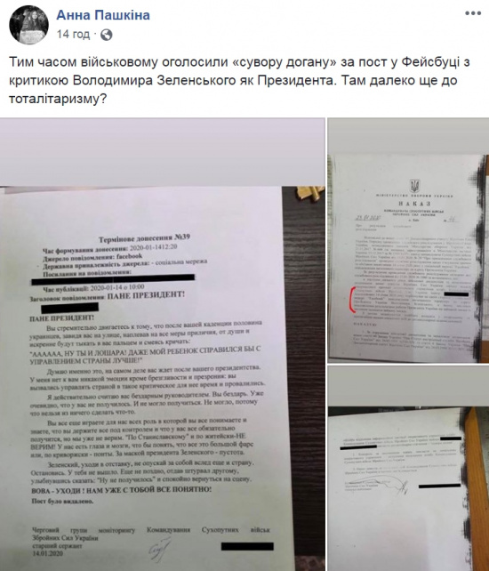 «Между тем, военному объявили «строгий выговор» за пост в Facebook с критикой Владимира Зеленского как президента. Там далеко еще до тоталитаризма?» — возмутилась Пашкина.
