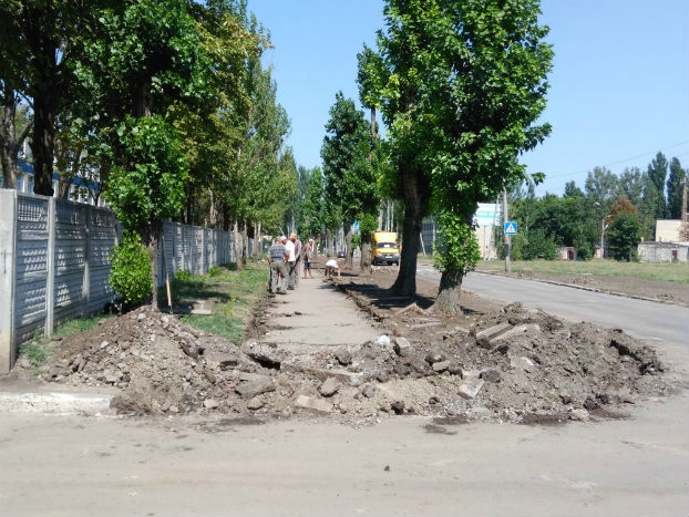 Через дорогу на пустыре микрорайона «Солнечный» бригада укладчиков тротуарной плитки прокладывает новые пешеходные дорожки. Подрядчики по опиловке деревьев омолаживают все, что не успели омолодить весной.