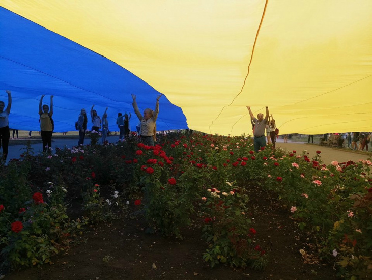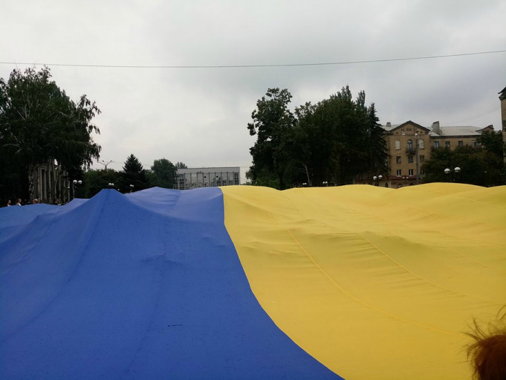 На этом празднование не закончилось. Присутствующие развернули флаг Украины размером двадцать четыре на двадцать шесть метров.