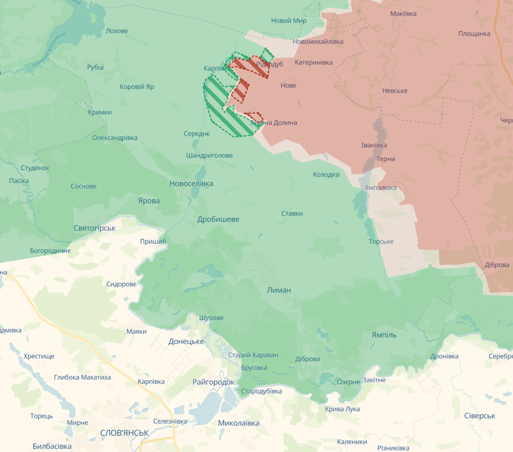 Также уточнена линия столкновения возле Редкодуба и Карповки в Донецкой области (Лиманская громада). Об ухудшении ситуации на Лиманском направлении сообщает утром 24 июля Бунятов Станислав, военнослужащий с позивным «Осман». Он пишет, что противник просочился к Торскому и занял оборону в окружении.