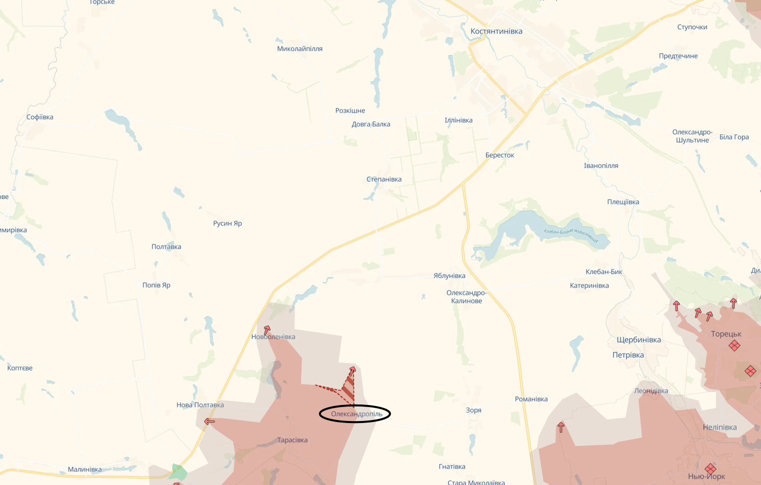 «Как уже я отмечал, противник сместил акценты и перестал вести штурмовые действия со стороны Торецка и Нью-Йорка, активизировался на юго-западе от Константиновки, где долгое время было затишье в отношении других участков на направлении. За последнюю неделю враг имеет продвижение в районе Александрополь - Новооленовки; со стороны Романовки прорываются в Яблуновку (в которую они уже несколько раз рандомно залетали, к счастью, удалось выбивать).
