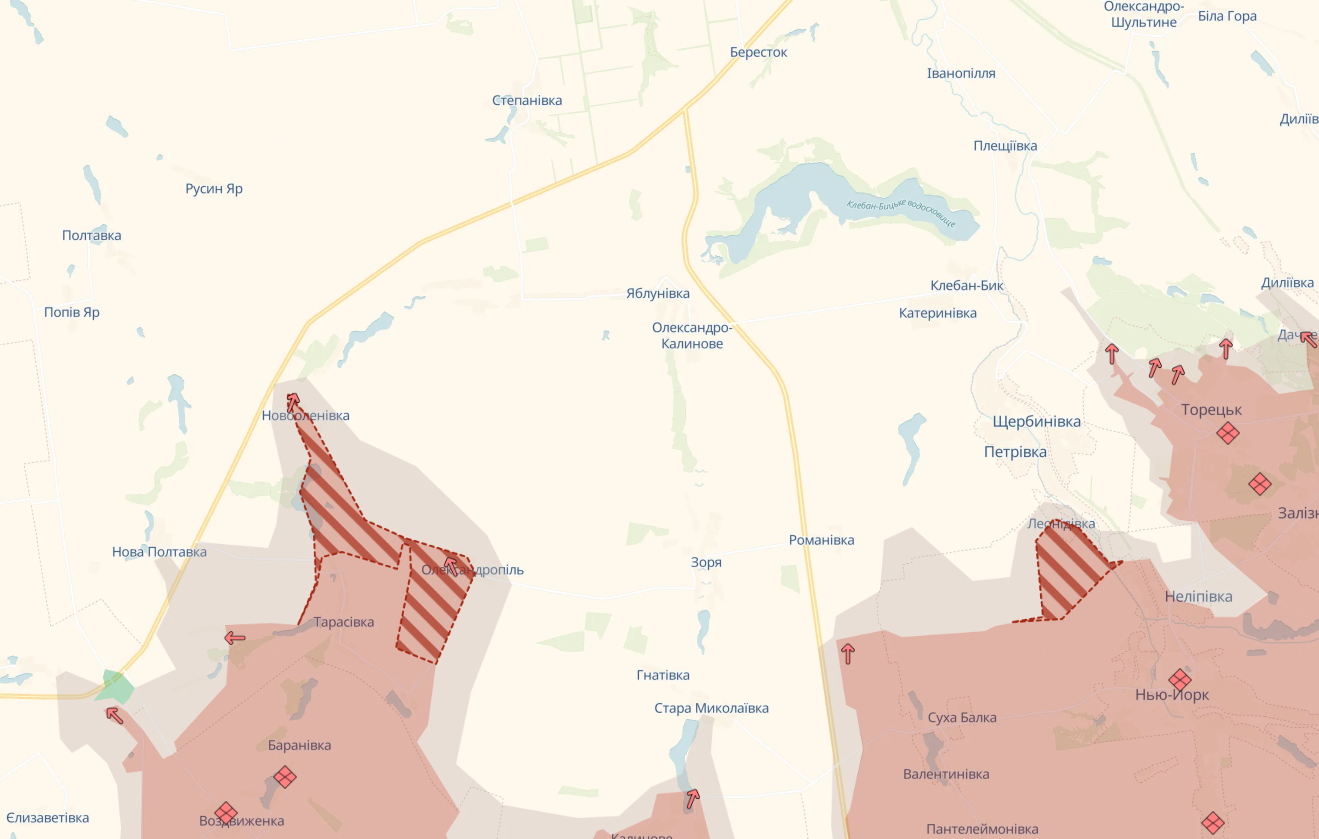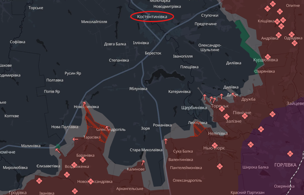 Значительное продвижение россиян в сторону Константиновки фиксируют сразу с двух сторон: в Ильиновской громаде вдоль трассы Покровск - Константиновка и западнее Торецка.