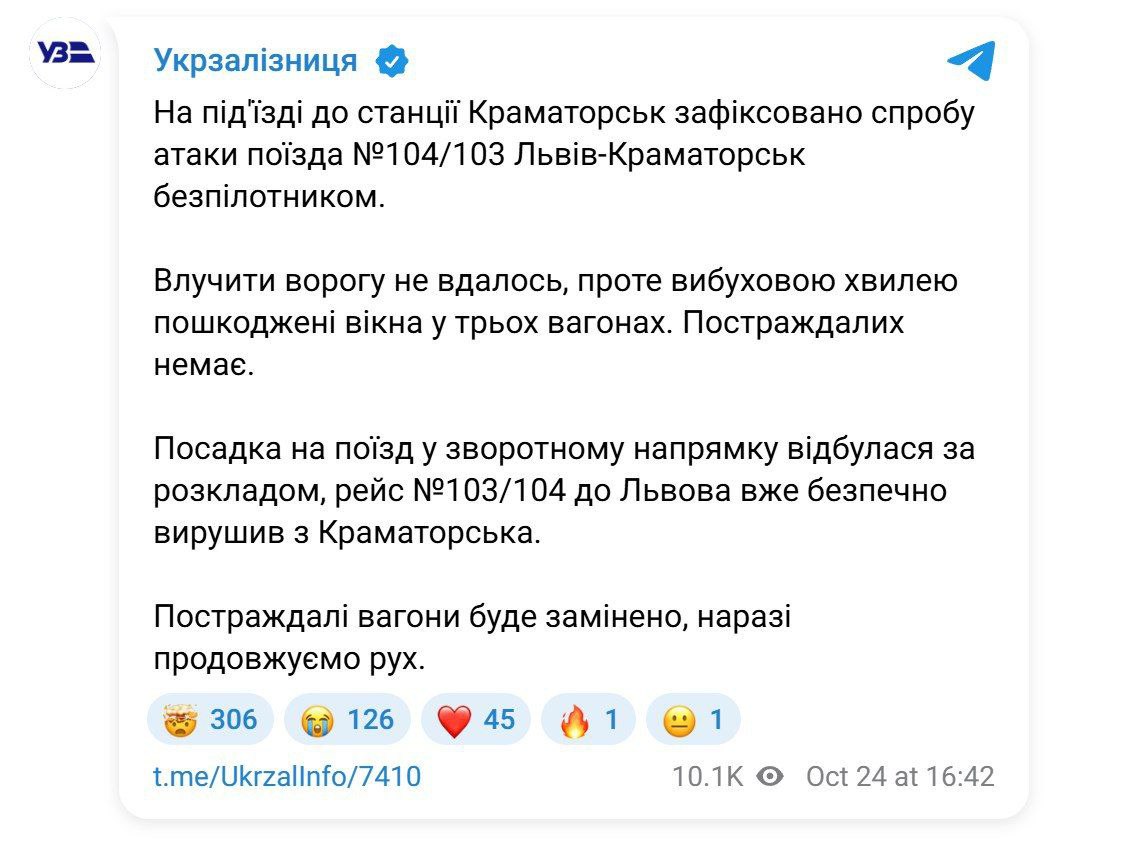 Как сообщает Укрзализныця, сегодня, 24.10 на подъезде к станции Краматорск россияне предприняли попытку атаки беспилотником по пассажирскому поезду №104/103 Львов - Краматорск. Попасть в цель не удалось, однако взрывной волной повреждены окна в трех вагонах.