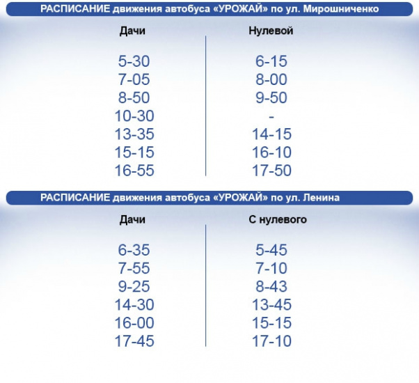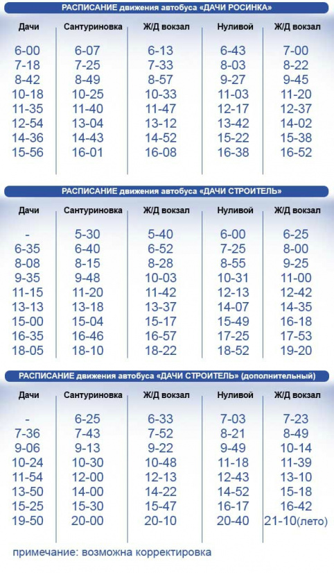 Автобус по маршруту «Дачи «Росинка» выходит с дачного поселка в 6:00 и через ж/д вокзал везет пассажиров на Нулевой. А оттуда таким же путем едет обратно. Интервал движения 1 час 40 минут.