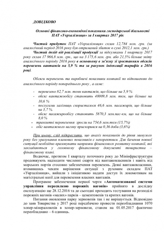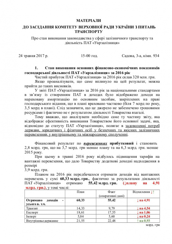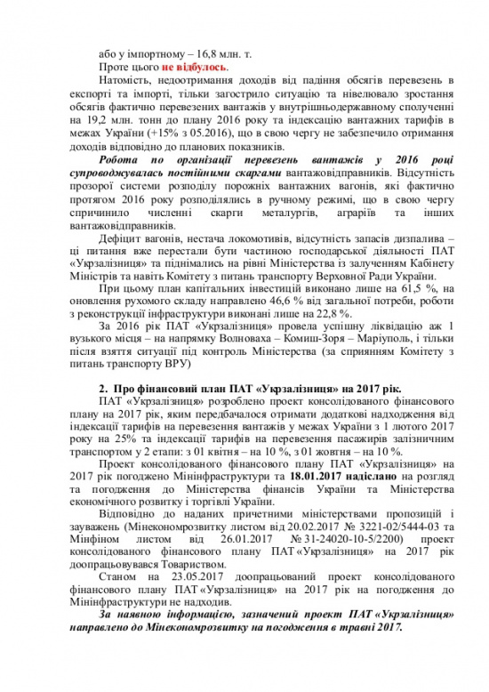 Так план капитальных инвестиций в 2016 году УЗ выполнила почти на 62%, на обновление подвижного состава потрачено не более 47% от потребности, а инфраструктура реконструирована не более, чем на 23%. Есть у ведомства претензии не только к вагонному парку УЗ, но и к локомотивам, проблему с дефицитом которых госкомпания так и не решила: в прошлом году из запланированных 122 локомотивов были отремонтированы только 86.