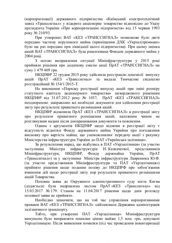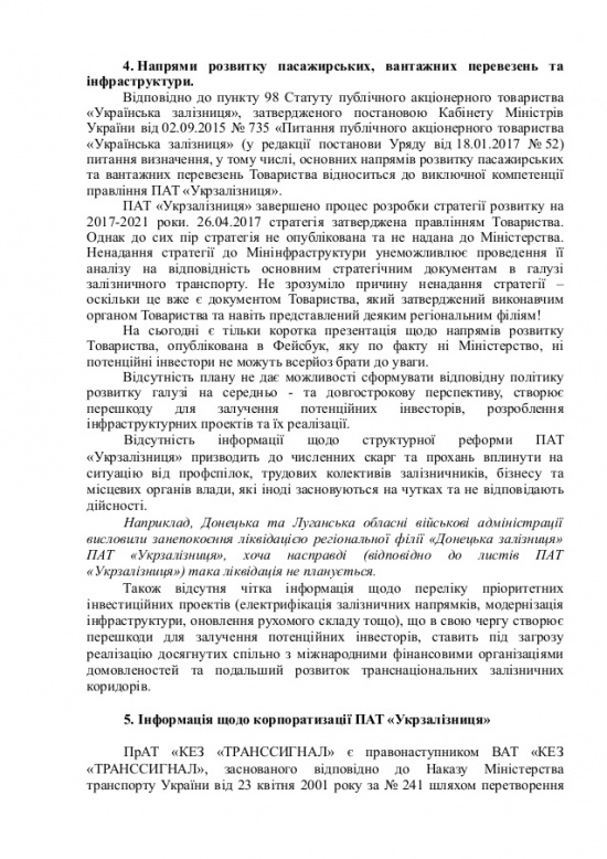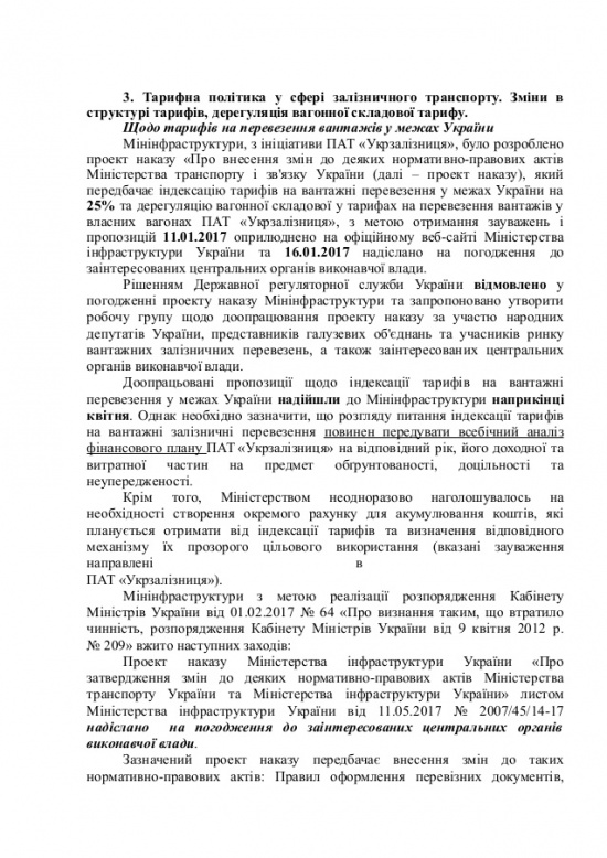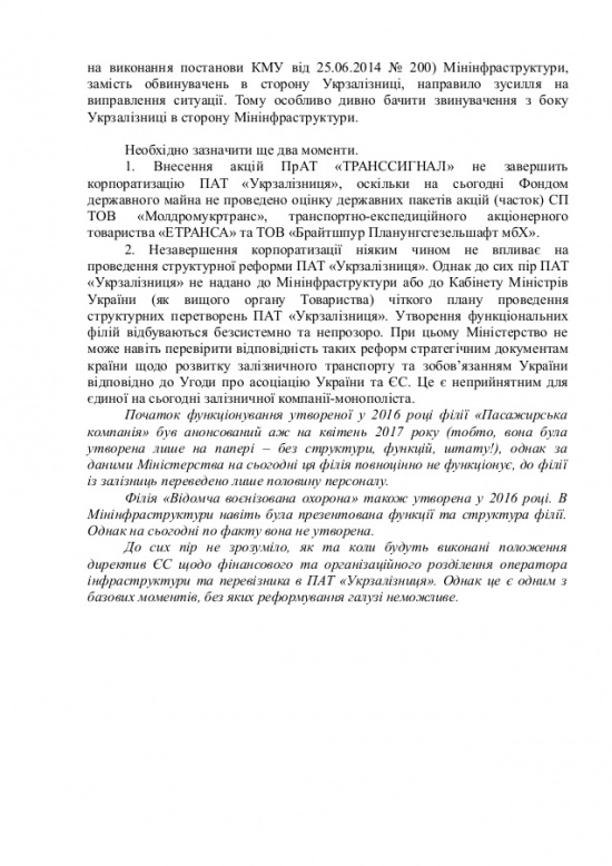 Недовольство министра, согласно аналитической записке, связано с тем, что в «Укрзализныце» не внедрена автоматизированная система распределения порожних вагонов. Соответствующее программное обеспечение принято в эксплуатацию еще в конце прошлого года, но до сих пор проходит тестирование на распределение цементовозов и крытых вагонов. Кроме того, по версии ведомства, неудовлетворительна работа госкомпании по улучшению состояния железнодорожной инфраструктуры и обновлению подвижного состава.