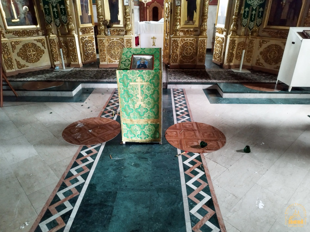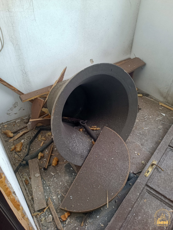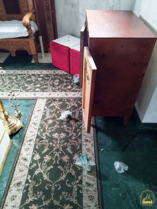 Не обошли стороной и внутренние помещения храма. Из нижнего придела украдены четыре подсвечника, из алтаря — напрестольные и требные Евангелия, напрестольные лампады и подсвечники, семисвечник, распятие с жертвенника и латунный алтарный аналой. Оставшиеся церковные предметы были разбросаны, лампады разбиты. Кроме того, злоумышленники вскрыли церковную кружку.