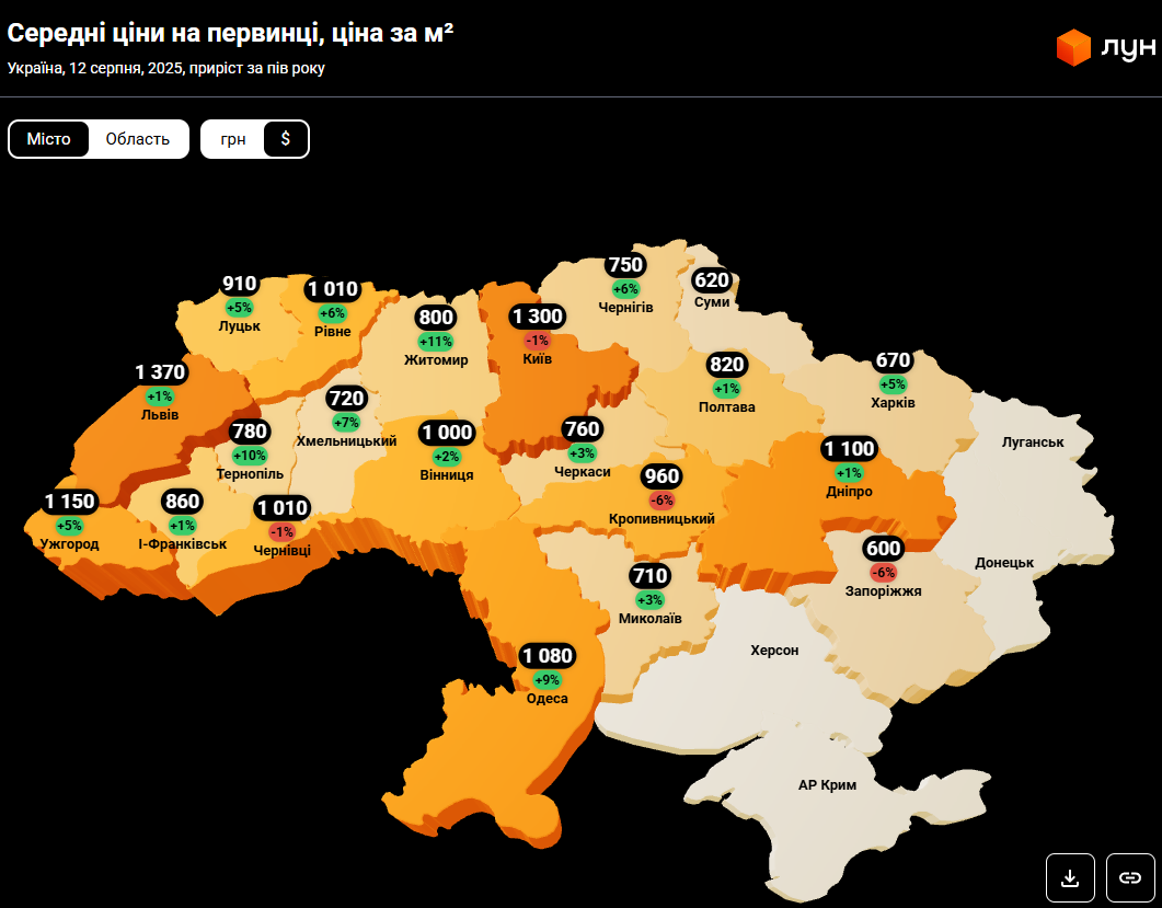 Вторичный рынок: +5% по стране за первые пять месяцев 2025 года. Первичный рынок: средний рост +14%, лидер — Кропивницкий (+33%).