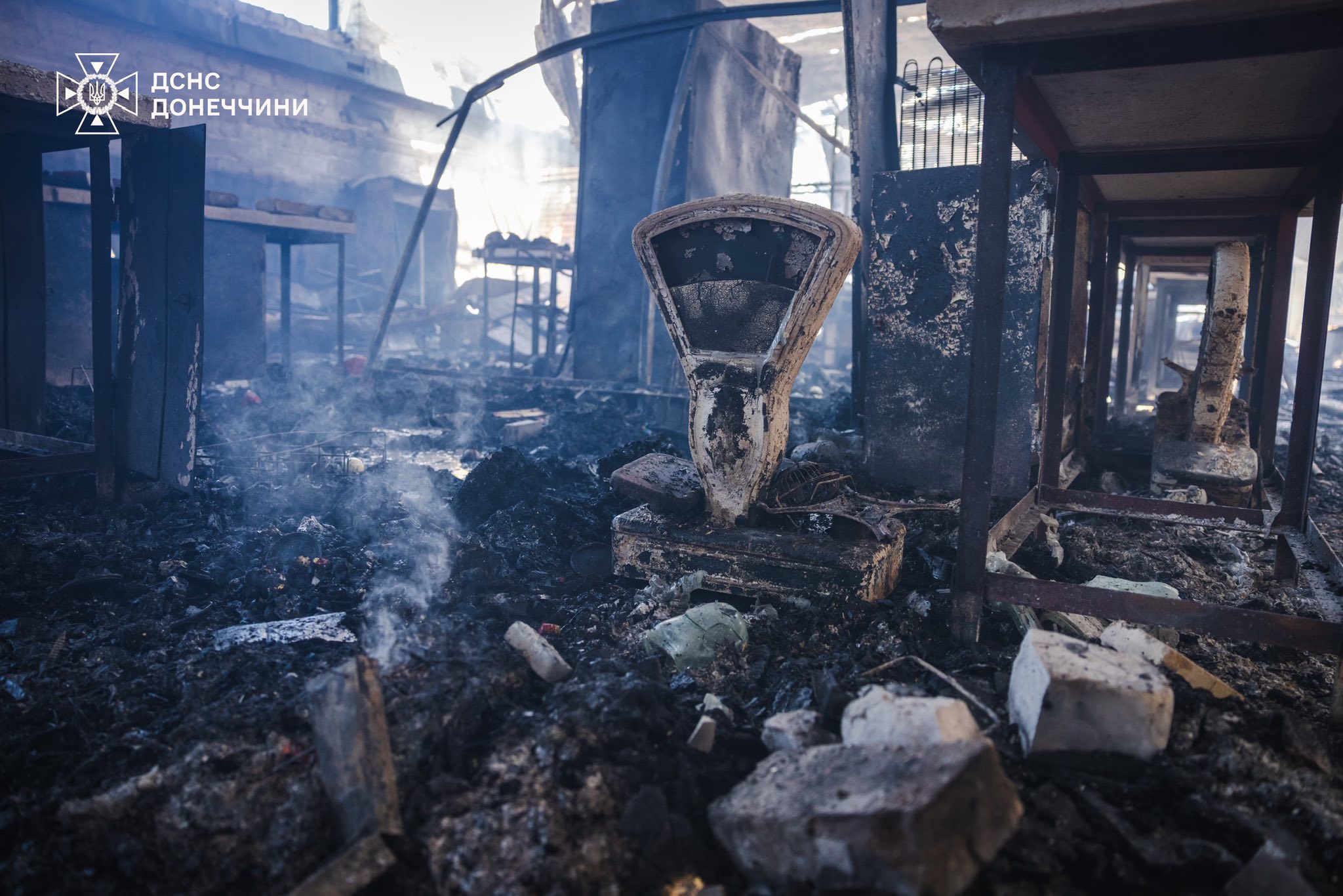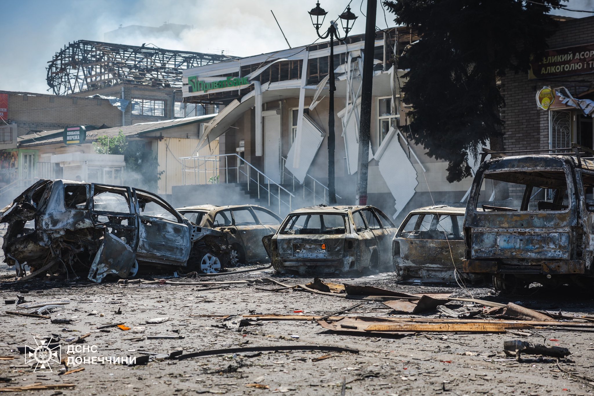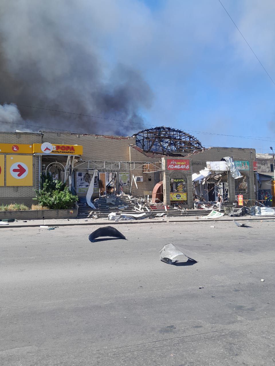 В результате атаки повреждены 2 жилых дома, торговый комплекс, три админздания, магазин, уничтожено 9 гражданских автомобилей.