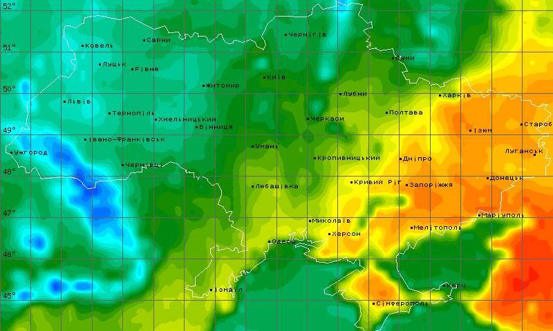 На западе страны температура будет заметно ниже — +21…+25, на севере — +24…+28, на юге — +30…+33, в Запорожье — до +37. В центральных областях — от +22 в Винницкой до +35 в Днепропетровской.