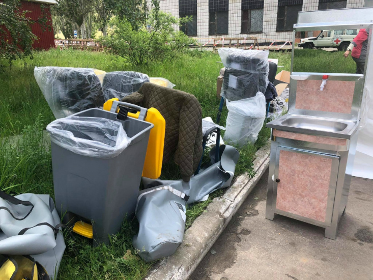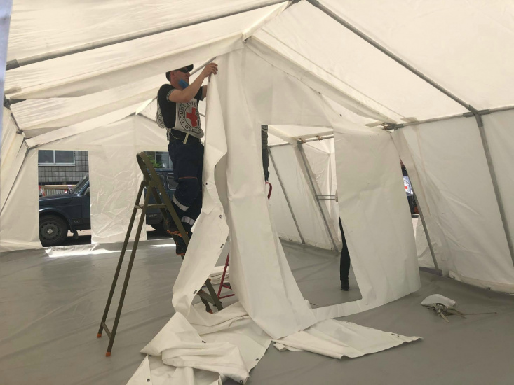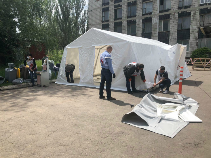 Сегодня перед главным входом в Центральную больницу, ведутся активные работы по установке палатки предварительного скрининга.