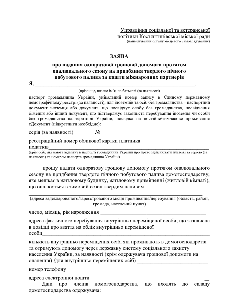 Помощь предоставляется, в том числе, жителям Константиновской громады, которые фактически проживают на её территории, не зарегистрированы как внутренне перемещенные лица в других громадах и проживают в домах, отапливаемых твердым топливом.