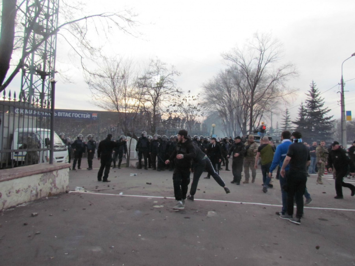 Чуть позже противостояние возобновилось, но уже в другой части. Однако рукопашный бой между сторонами быстро завершился. К ним вышел присутствующий на матче глава ОГА Павел Жебривский.
