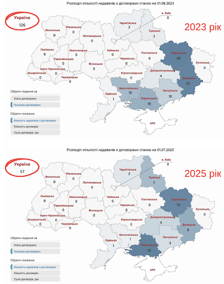 На июль 2025 года пакет №57 («Готовность и обеспечение оказания медпомощи населению на территориях, где ведутся боевые действия») получают всего 57 медучреждений. Для сравнения, в мае 2023 года таких было 126. Общий объем финансирования за это время снизился втрое — с 5,36 млн грн до 1,87 млн грн.