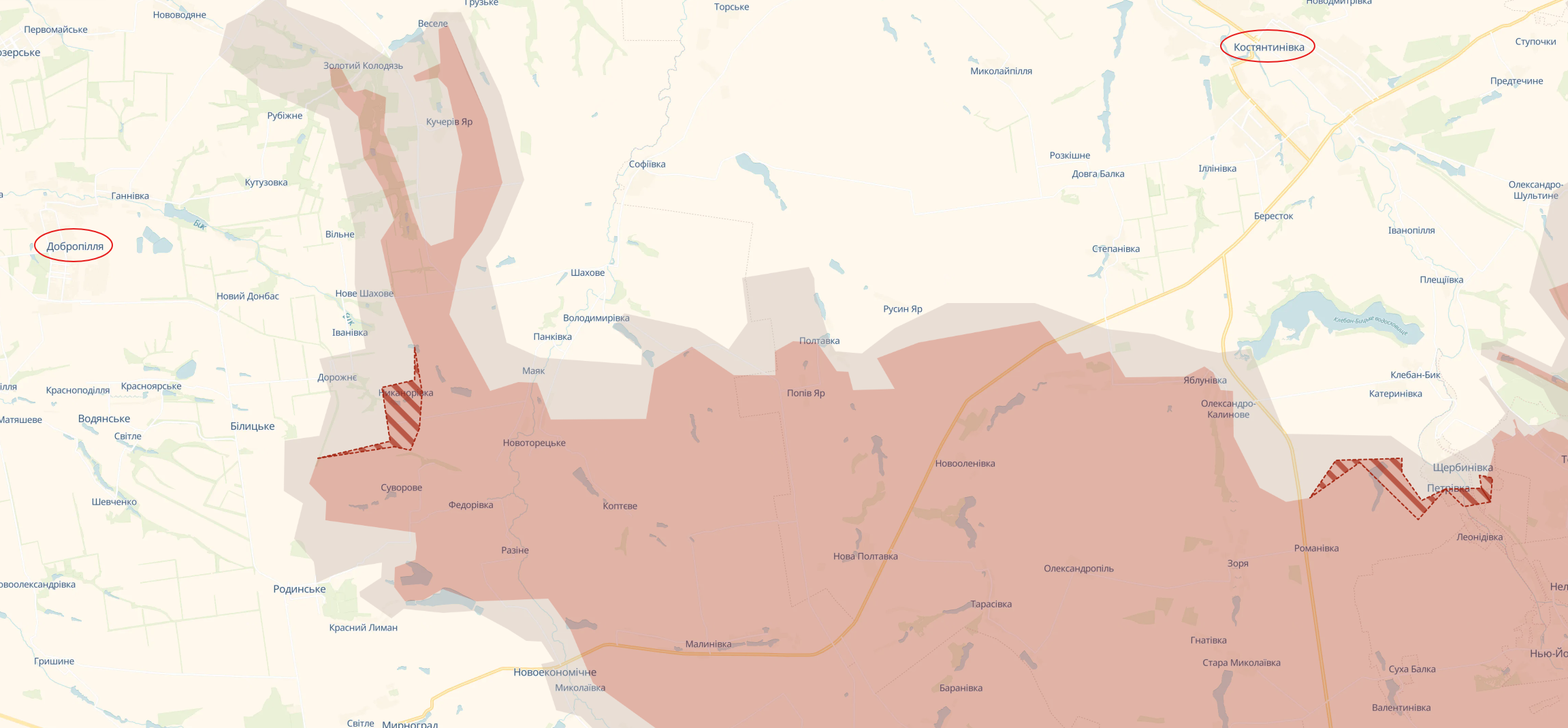 Также армия РФ выравнивает линию боевого столкновения южнее Константиновки — аналитики сообщают о продвижении противника в Щербиновке и вблизи Петровки.
