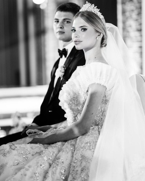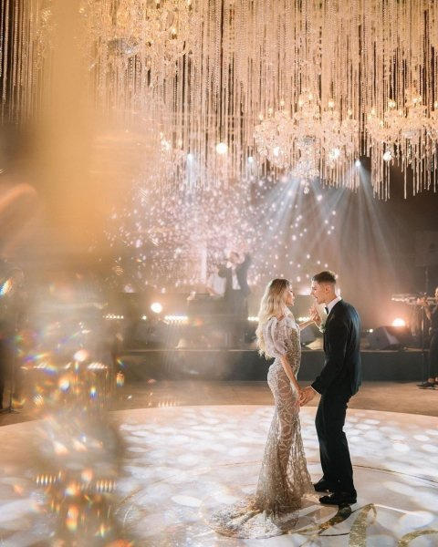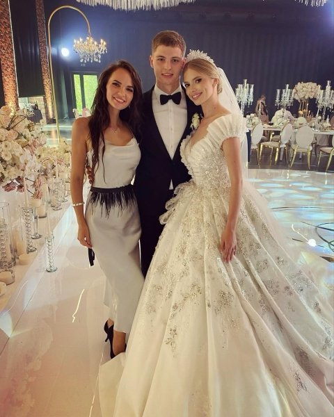 Шикарную свадьбу пара сыграла в загородном комплексе на берегу Днепра. Невеста выбрала два платья: на официальной церемонии девушка появилась в пышном белом наряде, а позже вышла к гостям в блестящем платье с объемными рукавами.