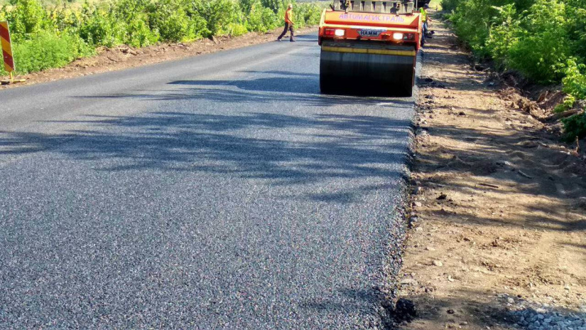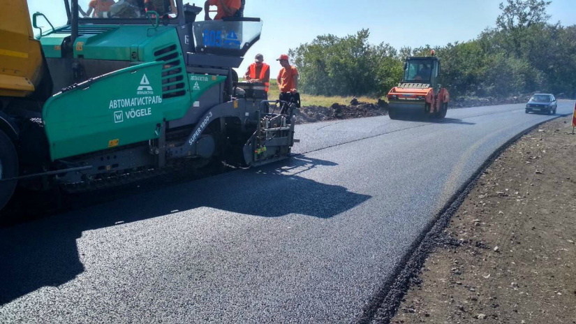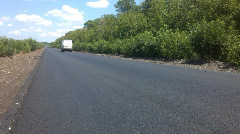 Возле села Андреевка выполнены работы по полной замене дорожного покрытия, на остальном участке трасса восстановлена усовершенствованным методом текущего среднего ремонта – технологии холодного ресайклинга.