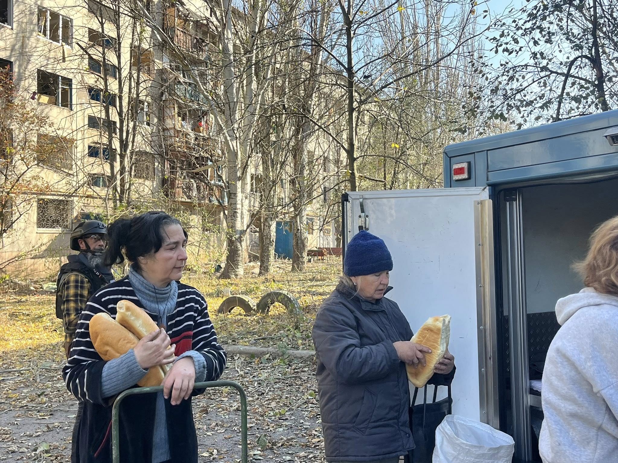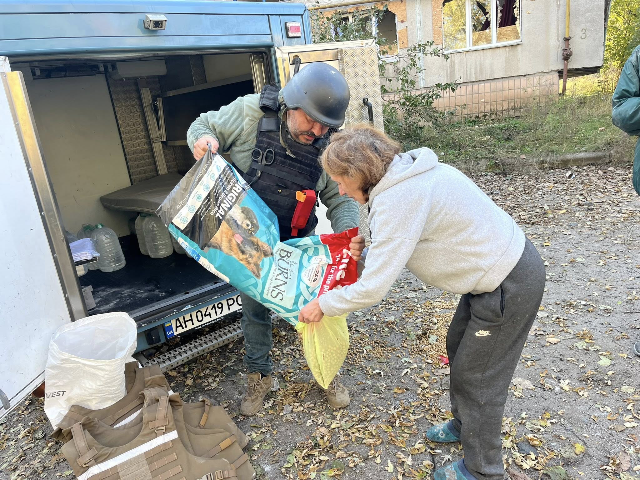 Волонтеры миссии привезли с собой свежий хлеб, воду и мешок корма для животных.