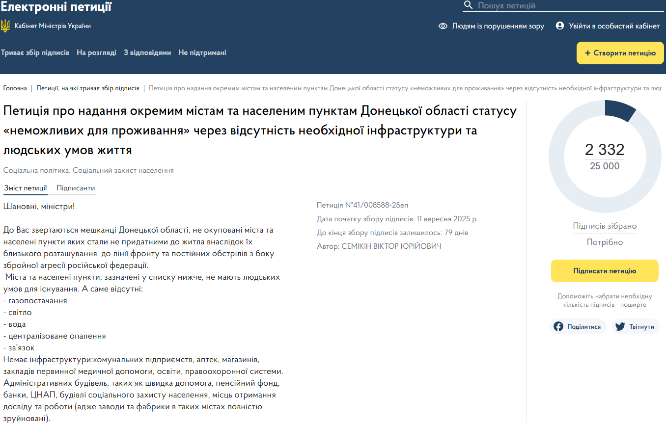 зарегистрирована петиция с просьбой предоставить отдельным городам и населенным пунктам Донецкой области статус «непригодных для проживания». Авторы обращения отмечают, что из-за близости к линии фронта и постоянных обстрелов многие населенные пункты региона утратили инфраструктуру и элементарные условия для жизни.