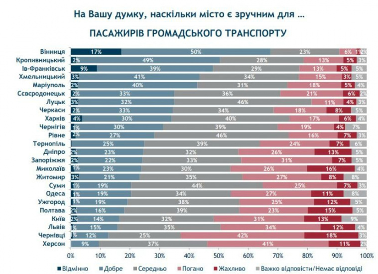Пассажиры общественного транспорта в Мариуполе в целом чувствуют себя комфортно: 40% опрошенных дали оценку «хорошо». Почти точно так же Мариуполь комфортный для водителей автомобилей. В меньшей мере комфорт ощущают водители мотоциклов и мопедов.