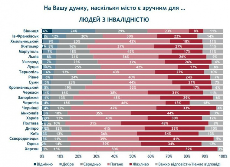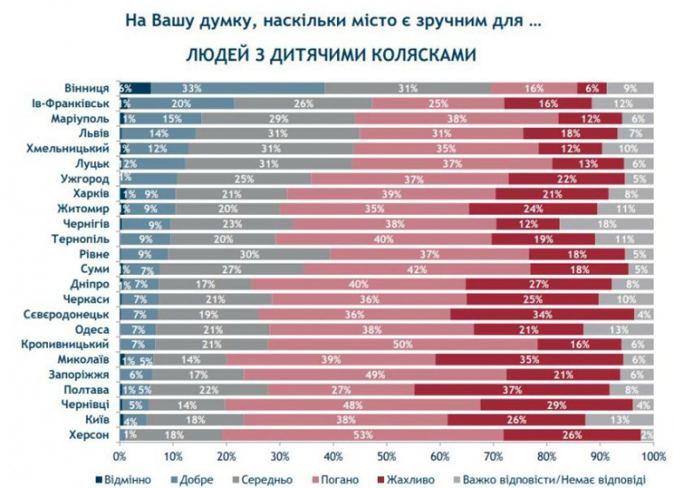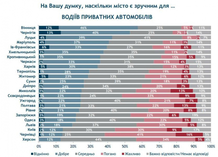 В то же время велосипедисты не так довольны инфраструктурой. 47% участников опроса заявили, что город плохой и ужасный для велосипедистов. Стоит отметить, что Мариуполь не сильно отличается по этим показателям от других украинских городов. Только велосипедисты Винницы и Ивано-Франковска чувствуют себя комфортно.