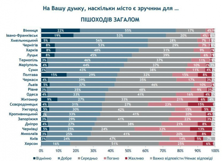 Почти половина опрошенных положительно оценили инфраструктуру для пешеходов. Еще 37% мариупольцев дали среднюю оценку комфортности среды для пешеходов.