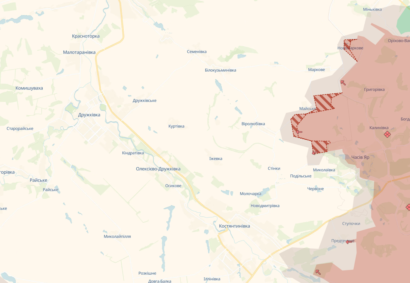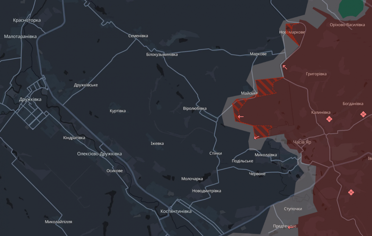 На карті аналітичного ресурсу DeepState увечері 7 січня з'явилися зміни на північ від Часового Яру: армія РФ просунулась у двох селах Костянтинівської ТГ — Майському та Новомарковому. Останнє повністю окуповане.
