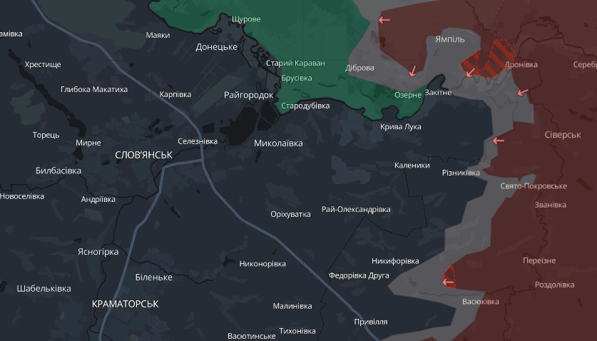 Армія РФ просунулась неподалік траси Бахмут-Слов'янськ — біля Пазено, а також у районі Дронівки (яка на карті повністю під контролем противника) на Слов'янському напрямку. Повідомляється і про просування у Вовчанську.